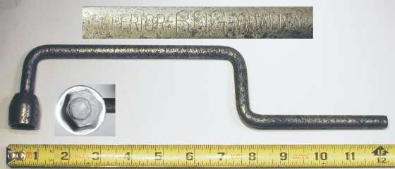 A tool very similar to this was listed on page 57 of the 1927 Western Auto (Western edition) catalog as a "4-In-1 Rim Wrench" for a $3.45 price. However, the socket carrier and handle shape have a sufficiently different appearance to rule out Bog as the maker. In addition, the text mentions a locking capability, leading us to conclude that this rim wrench was likely made by the J.H. Faw Company, based on patents for a locking socket carrier.