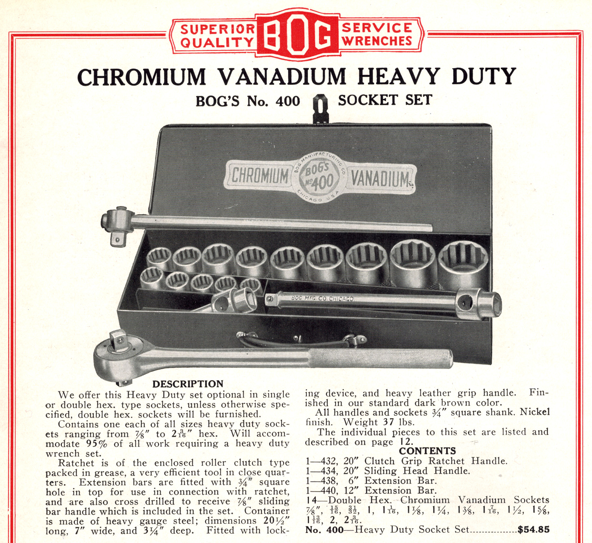 By 1928 Bog was offering a new No. 600 C.V. socket set with chrome-vanadium sockets, as well as the Nos. 400 and 404 C.V. heavy-duty socket sets in 3/4-drive. These changes roughly mirrored developments at other Chicago-area tool companies (and competitors) such as Hinsdale and Duro/Indestro, although Bog was somewhat ahead of the others in both the adoption of alloy steel and in the move to 3/4-drive.