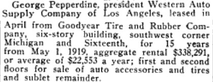 During our searches for information on Bog, we ran across a business venture in Chicago established by George Pepperdine, the founder of Western Auto Supply. In 1919 Pepperdine set up the National Auto Supply Company in Chicago to sell auto accessories and tires, but according to his biography the true intent was to establish a retail and mail order operation in the East that could eventually be merged with Western Auto Supply.