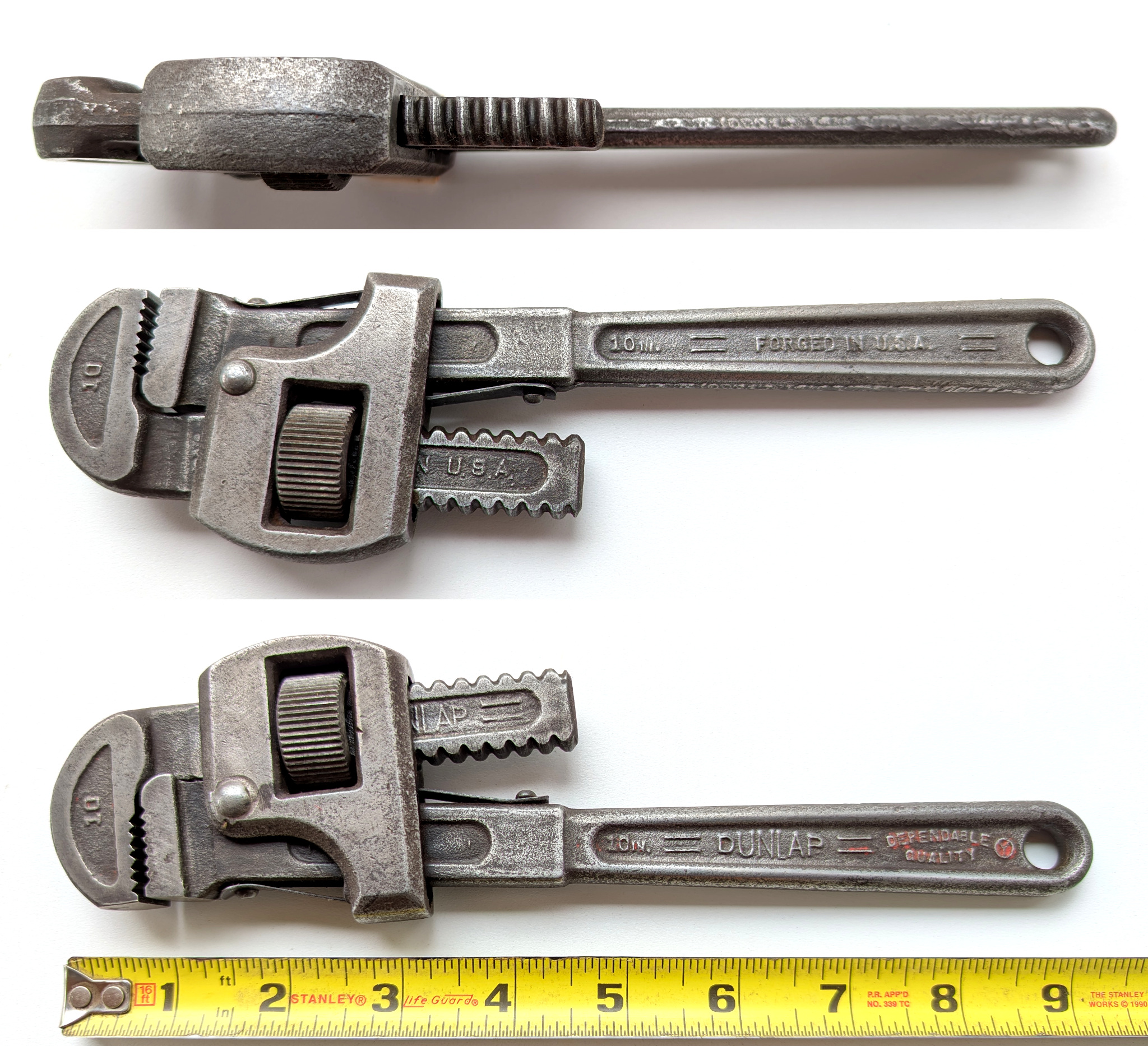 Sears had offered Stillson-pattern pipe wrenches under the Dunlap brand since the late 1930s, with the early suppliers including J.P. Danielson and Erie Tool Works. An example can be seen as the Dunlap "Approved" 8 Inch Stillson-Pattern Pipe Wrench.