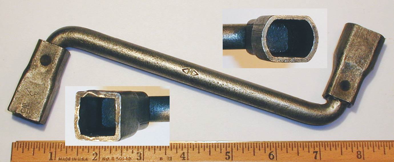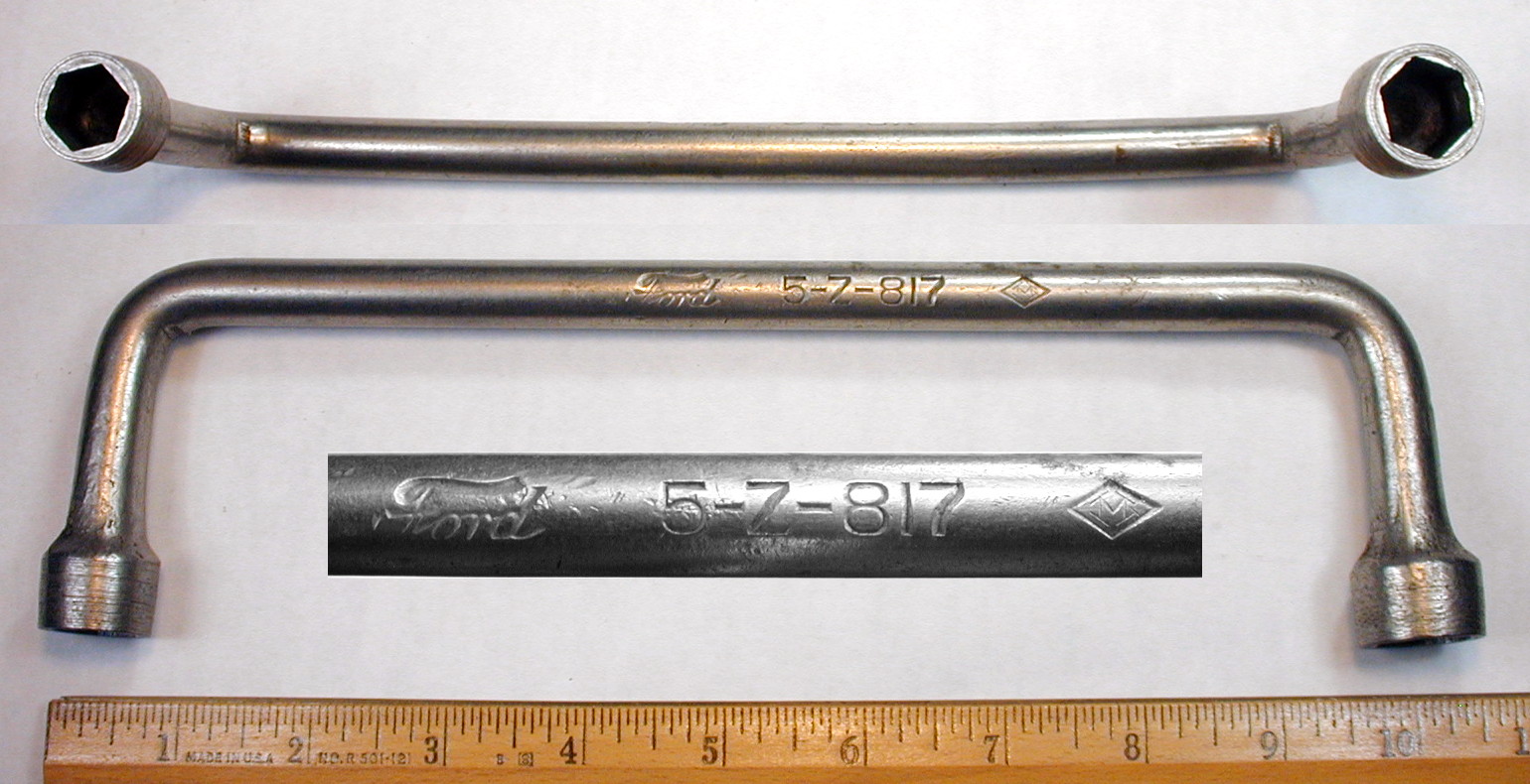 This wrench was one of the tools included in the Mossberg No. 17 wrench kit for the Ford Model T, a set of five fixed socket wrenches in a canvas roll.