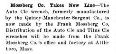 Another early business venture, the Mossberg Wrench Company, was also founded in Attleboro, probably in the early 1890s. (Mossberg Wrench might have been a subsidiary of Mossberg Manufacturing, although the exact relationship is not yet clear.)