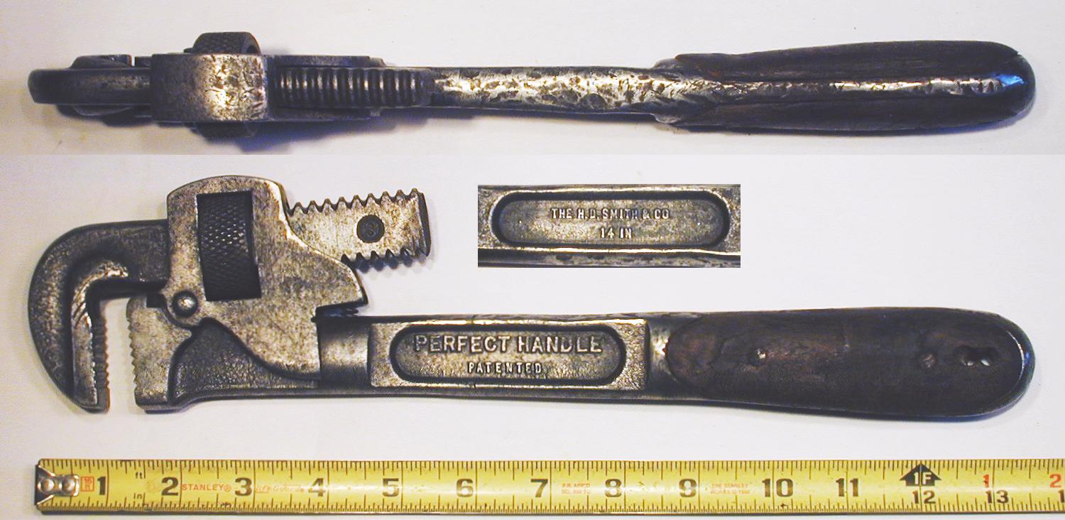 Fig. 10 shows an H.D. Smith Stillson-pattern 14 inch pipe wrench, marked with "Perfect Handle" and "Patented" forged into the shank, with "The H.D. Smith & Co." and "14 In." forged into the back side.
