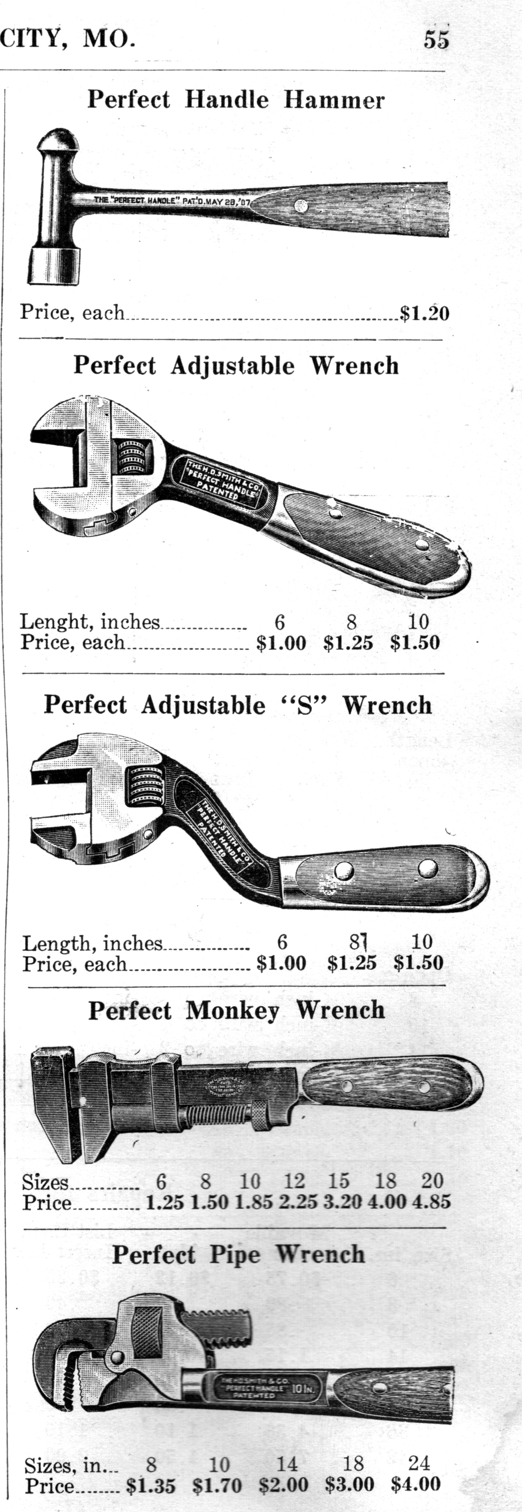Under the new management the company's best known product became a line of tools with riveted wooden handles sold under the "Perfect Handle" brand. The tools supplied with "Perfect" handles began with monkey wrenches and proceeded to include screwdrivers, hammers, pipe and nut wrenches, open-end wrenches, draw knives, and even a valve lifter.