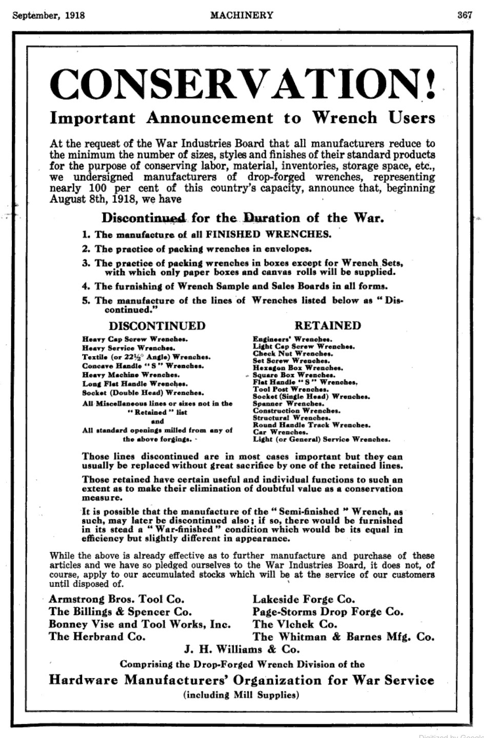 The scan in Fig. 4 shows the "Conservation!" statement issued by the group, as published on page 367 of the September, 1918 issue of Machinery. The text notes that the nine companies signing the agreement accounted for almost the entire production of the drop-forged wrench industry.