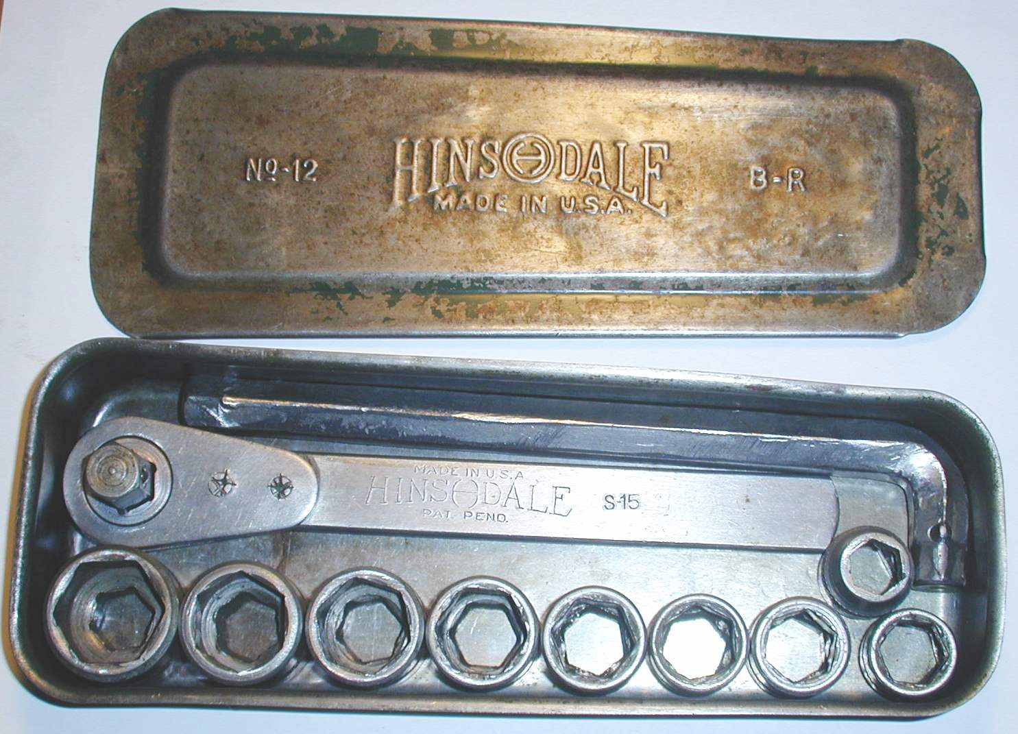 In the early 1920s Hinsdale sold pressed-steel socket sets similar to sets from Mossberg and Walden, but with some changes as well. Hinsdale treated the sockets as 1/2 square drive only and did not supply tools for driving the sockets on the outside of the base, as Mossberg, Walden, and many others had done.