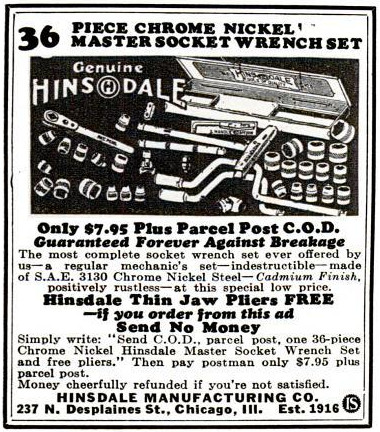 By 1930 the Sears catalog was offering a 46-piece socket set in a hip roof toolbox, identifiable as Hinsdale by the illustration of the distinctive Convertible T-L Handle with the Hinsdale name visible. The Sears listing also noted the "strongest alloy steel" of the sockets, making this the first alloy steel socket set offered by Sears, and one of the earliest available through mass market retailers. An example of this set can be seen as the Hinsdale Chrome-Nickel "Mechanics" Set.