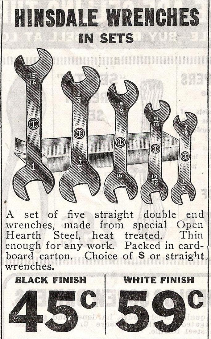 By 1922 Hinsdale tools were being offered by Montgomery Ward, a major retailer with both catalog sales and a chain of stores with a national footprint. Page 594 of the 1922 Montgonery Ward catalog lists S-shaped open-end wrenches illustrated with the Hinsdale Round-H-Circle logo.