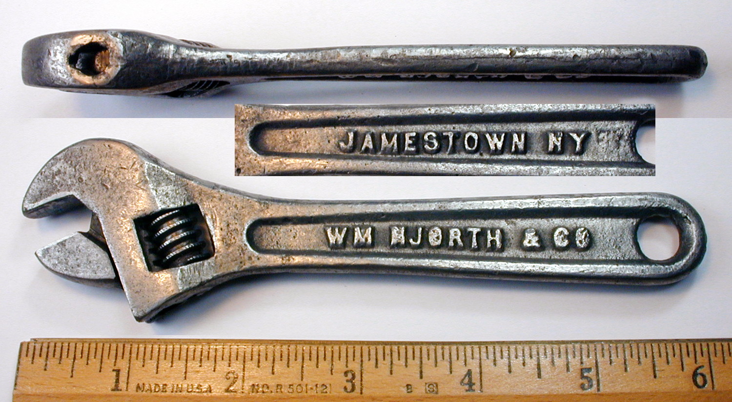 Fig. 9 shows a Hjorth 6 inch adjustable wrench, marked with "Wm. Hjorth & Co" forged into the shank, with "Jamestown NY" forged into the back side.