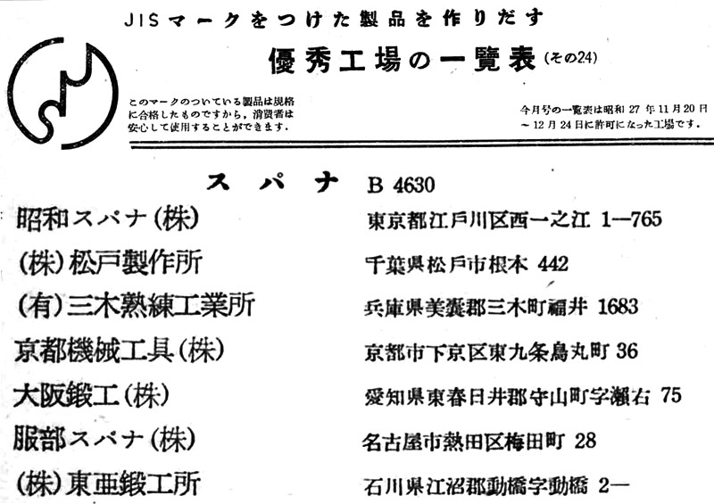 | まこと刃物製作所 (Makoto) | B4604 | 466055 | 1966 | Certification for adjustable wrenches Possibly in 1967-03 issue; search on JIS |