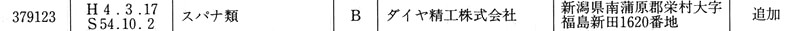 | 379123 | H 4. 3.17 S 54.10. 2 | ス パ ナ | B | ダイア精工㈱ | 新潟県西蒲原郡栄村大字福島新田1620 | 追加 |