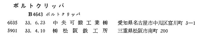 | 5901 | 1967.4.20 | ㈱松阪鉄工所 | 三重県津市高茶屋小森町1814番地 | B4643 |