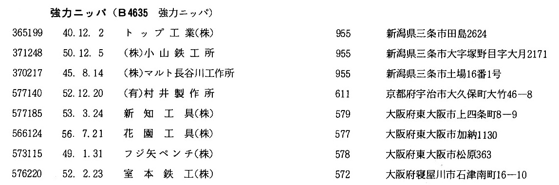 | 389045 | 1989.9.5 | ㈱角田工具製作所 燕工場 | 新潟県燕市大字杉柳270番地 | B4614 |