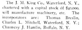 Fig. 3 shows a notice of incorporation for the J.M. King Company, as published on page 42 [External Link] of the March 1, 1906 issue of The Iron Trade Review.