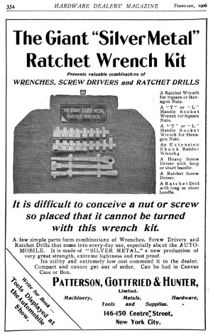 A rare 1906 catalog from Patterson, Gottfried, and Hunter shows a listing for the Giant "Silver Metal" Wrench Kit, with the illustration matching the early advertisement from this same company.