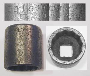Fig. 3 shows an early Plomb DD16 1/2-drive 12-point 1 inch socket, stamped "PLOMB" and "Los Angeles" with an "8B" date code for 1928. These are the typical markings for this period.
