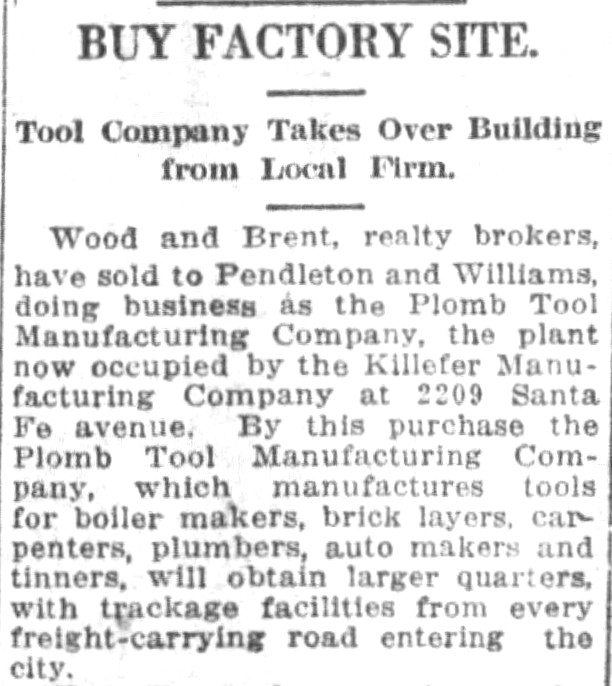 By 1920 the partnership was doing business as the Plomb Tool Manufacturing Company and made an important decision to purchase a factory at 2209 Santa Fe Avenue, the site it would occupy for many decades.