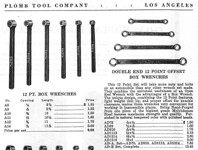 By 1926 Plomb was offering an A-series of single-ended 12-point box wrenches, making it one of the earliest (along with P&C) companies to offer such tools. These wrenches were an important new class of tools made possible by alloy steel.
